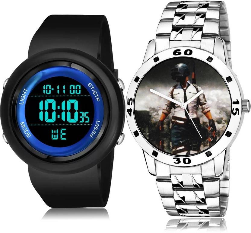 Dial Colour : Black ; Band Colour : Black And Silver ; Case Shape : Round ; Band Material : Plastic And Stainless Steel ; Case Diameter : 46 And 43 mm ; TIMOXIDE Brand New Fancy Digital Men Watch And Pubg Military Army Chain Watch Black And Silver Colour Analog And Digital Plastic And Stainless Steel Belt 2 Watch Combo For Boys And Men - DG55-B505