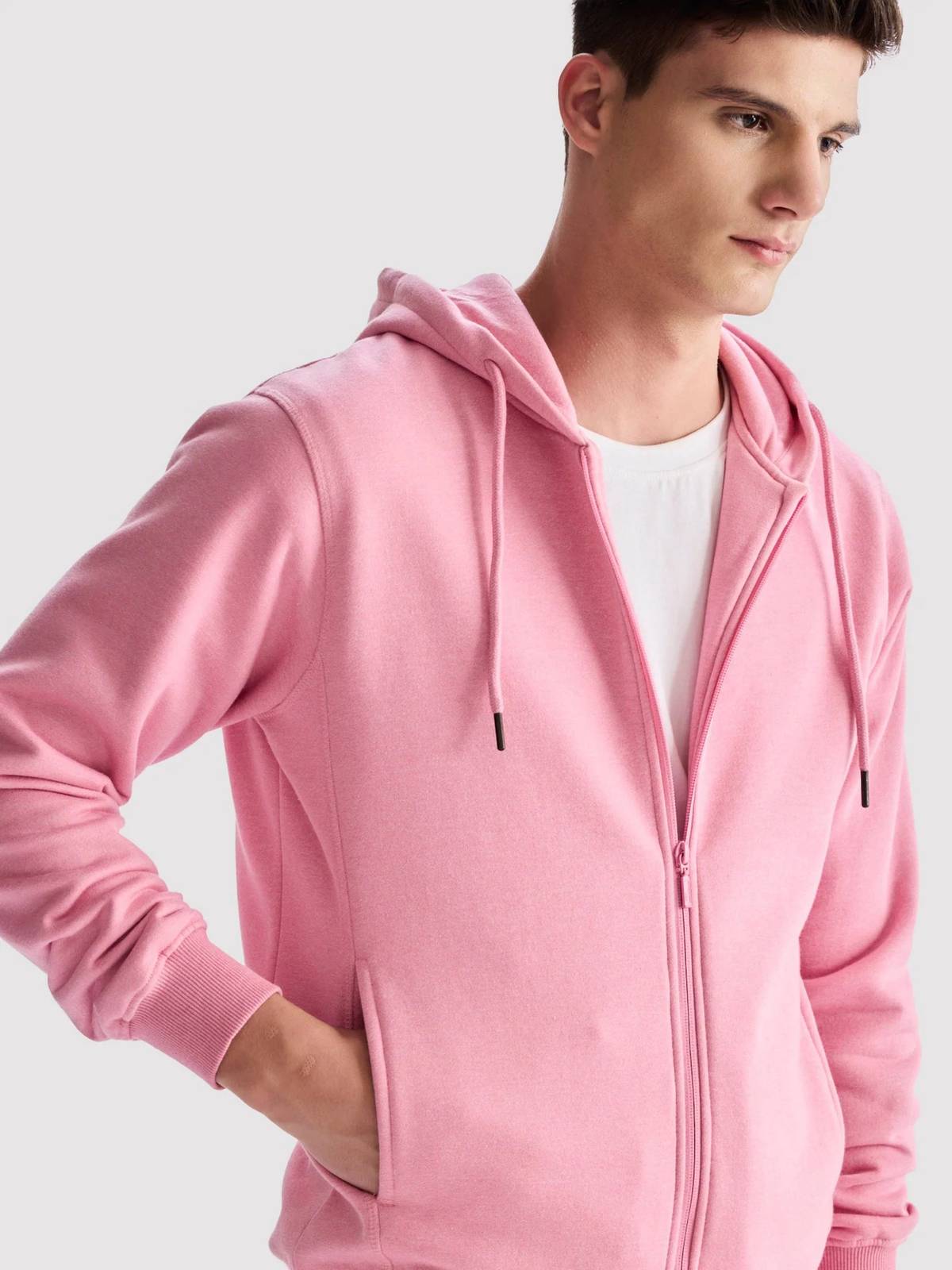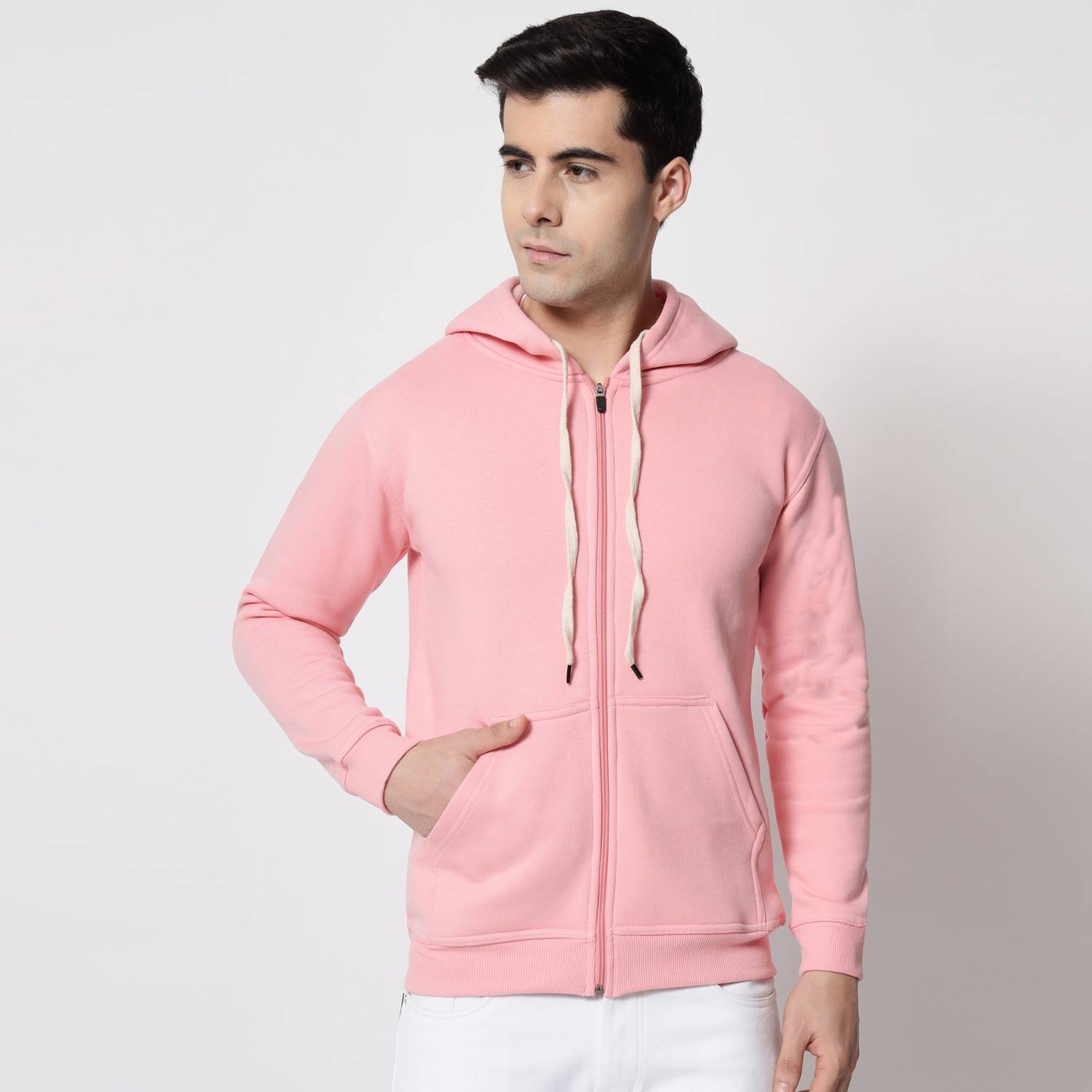 Designed for comfort and functionality, this hoodie features a soft, breathable cotton fleece blend that keeps you warm without weighing you down. The open front zipper design makes it easy to layer, while two roomy kangaroo pockets provide convenient storage and a casual look. Full-length sleeves with ribbed cuffs and a matching ribbed hem offer a snug fit and help lock in warmth. Perfect for cool-weather lounging, workouts, or everyday wear.
