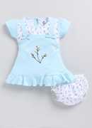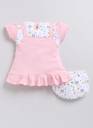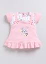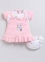 Dress your baby girl in style with this adorable pink cotton frock style top and matching panty set. Designed for comfort and cuteness, the frock features short sleeves, delicate floral embroidery, bow accents, and a frill hemline for a playful touch. The set includes a soft, elasticated printed bloomer to ensure a perfect fit. Crafted from breathable cotton, this outfit is perfect for keeping your little one cool and comfortable.
