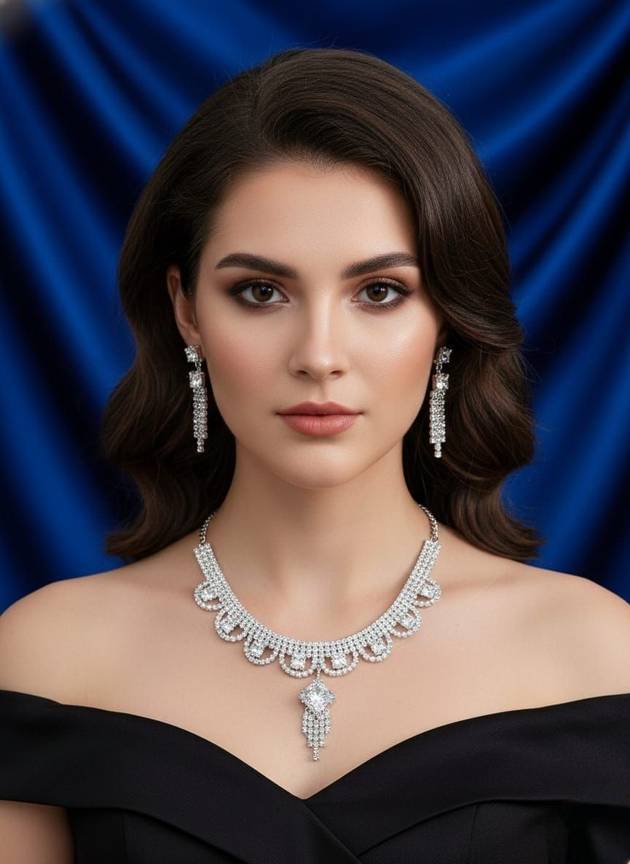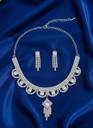 Make a graceful style statement with this silver plated diamond look necklace set with earrings for women, designed to bring elegance and sparkle to every special occasion. The necklace features a sophisticated design with shimmering stones that closely resemble diamonds, giving you a luxurious look at an affordable price.
