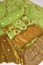 A:It includes one dupatta,one salwar and one top fabric. The dupatta material is with zari lining and the top fabric includes Mango border design the length of the salwar,top and dupatta is 2 meters