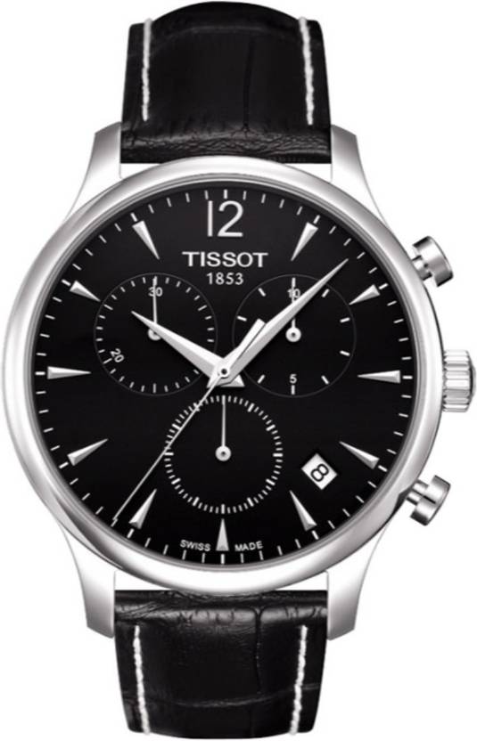 Look stylish with this stylish analog display mens watch from the house of Tissot. The round shaped dial, which is enclosed in a stainless steel case, looks outstanding with the leather styled strap. It has a polished bezel and a stylish crown and also comes with up to 30 meters of water resistance coupled with a chronograph.