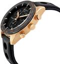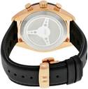Rose gold tone stainless steel case with a black leather strap. Black dial with gold-tone hands and index hour markers. Tachymeter. Luminescent hands and markers. Date display at the 4 o'clock position. Chronograph - sub-dials displaying: three - 60 second, 30 minute and 1/10th of a second. Dial Type: Analog. Quartz movement. Scratch resistant sapphire crystal. Water resistant. Functions: chronograph, date, hour, minute, second.