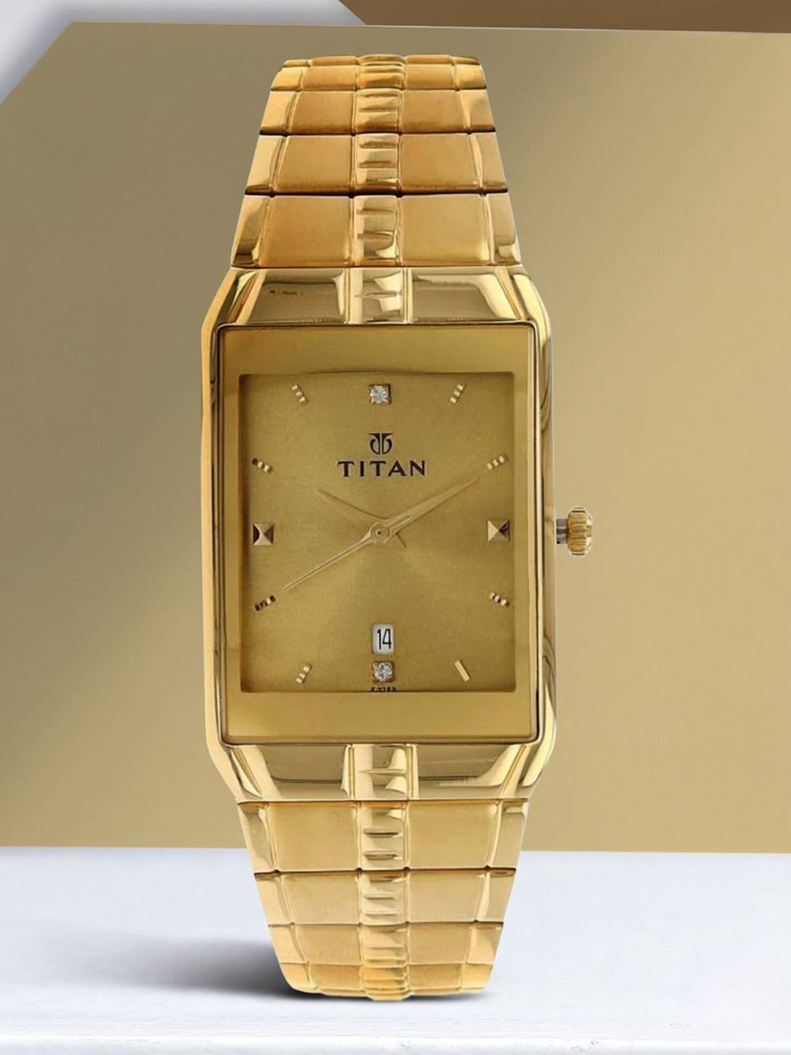 This analog watch for men features a gold, rectangular dial. The case is fitted with a crown that lets you adjust the time. The dial features plain three hands, slanted markings at five minute intervals, studded markings at quarter intervals and a date display. This timepiece comes with a 24 month warranty.