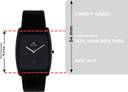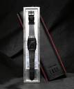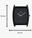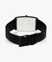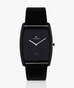 The watch’s black, tonneau dial is encased in a stainless steel case. The celebration of simplicity that’s echoed in this watch’s strap is continued in its dial.