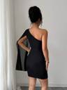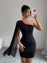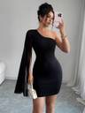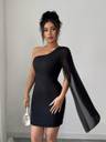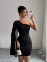 Turn heads with this one shoulder black mini dress, featuring a sheer drape sleeve for a bold yet classy look. Crafted from stretchable fabric for a perfect fit, this dress is ideal for cocktail parties, dinners, and special occasions. Its modern design and comfortable fit make it a must-have for every fashion-forward wardrobe.