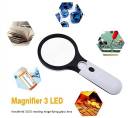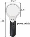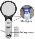 MATERIAL: The magnifier is made of high quality glass. White Energy-efficien LED bulbs require 3 AAA batteries lasting for a long time (batteries not included) The stylish color combined black and white.SPECIFICATION: The glass lens can reach 3X to 45X magnification. The large lens diameter 2.9 inch. The small lens diameter 0.8 inch, the whole length 7.5 inch, Handle length 4.1 inch, weight 4.4oz.HIGH QUALITY: It is composed of Comfortable & Non-slip ergonomic handle and scratch resist clear lens loupe. Lightweight durable frame - scratch resist. The optical lens is as smooth and clear as glass, small detials can be show clearlyREASONABLE DESIGN: It's convenient to turn lights with ON/OFF switch, three-battery slots are designed so that the lighting time is long enough for use. Excellent for reading, circuits, jewellery evaluating, etc. Very bright illumination and magnification that are suitable for night reading, antique appreciation, small prints, texts, tiny crafts and electronic parts. The ligh-tweight magnifier is ideal for traveling, outdoors, and lab.INDEPENDENT LIGHTING: 2 LEDs for the large lens and 1 LED for the small one, which are soft light without dazzling and reduces headaches caused by eye strain or squinting. Three built-in energy-efficient LED lights require 3 AAA batteries that powers it for months ensure better lighting and zoom effect and provide a precise, uniform, and bright illumination, make magnified text and images even more clear and precise.