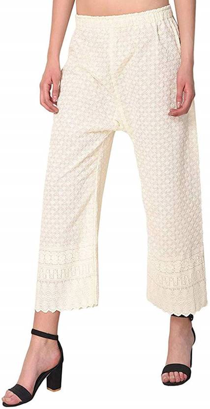 Women Lucknow Chikan Art Work Embroidered Cotton Palazzo. Palazzo length 49 inches with mid waist looks great and classy with both flats and heels. Keep cool in casual style with this cotton palazzos. Specially designed for your comfort. Actual product may vary a bit in colour and pattern due to photoshoot, lighting affect and your screen resolution. Casual cotton chickan palazzo with broad elasticated waistband.