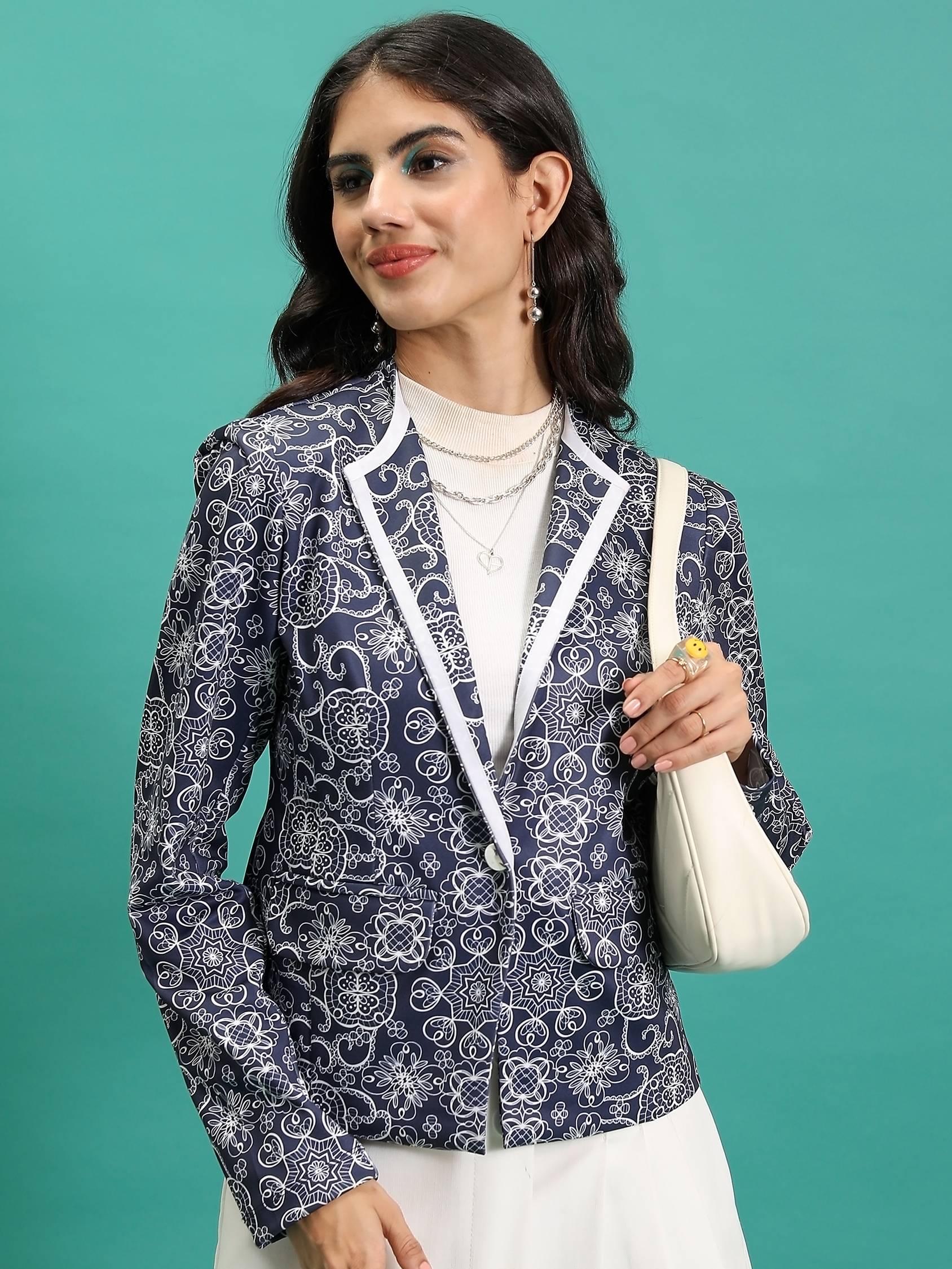 Tokyo Talkies Printed Single Breasted Casual Women Blazer (Dark Blue, White)