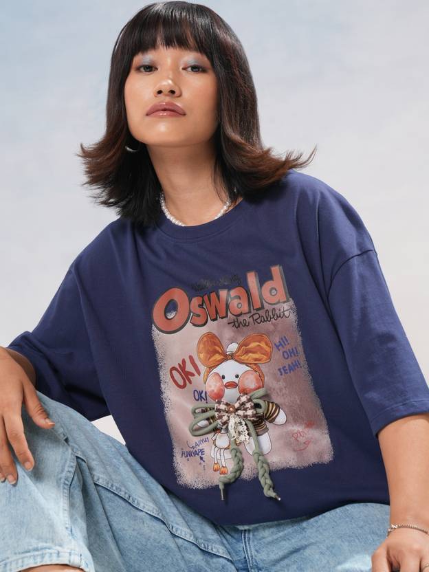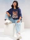 Tokyo Talkies Women Navy Oversized 3D Bow Applique Graphic Tshirt