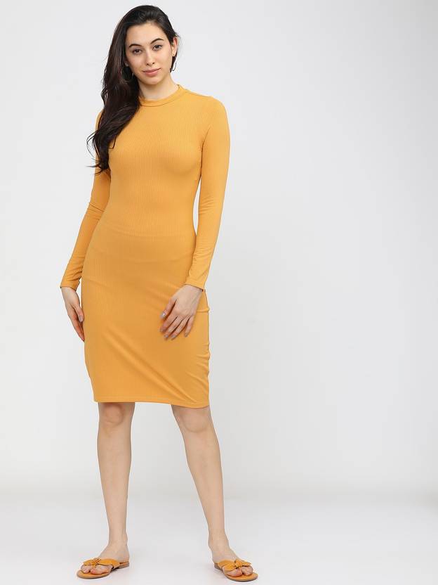 Tokyo Talkies Women Ribbed Yellow Knee Length Dress