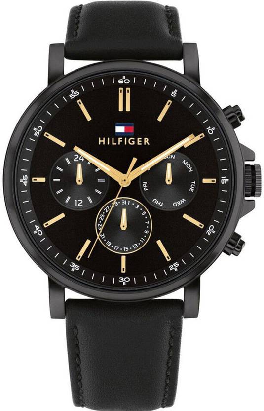 Tommy Hilfiger Men’s Watch. A classic timepiece for your everyday look, featuring a CD-textured matte sunray dial with diamond-cut sub-eyes and branding elements throughout.