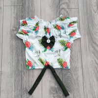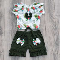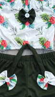 Featuring a charming blend of floral print for the top and a solid pattern for the bottom, this outfit creates a gentle yet lively contrast that suits young children. The floral pattern brings a sense of freshness, while the solid pattern of the shorts balances the overall look. Both the top and the shorts include contrast bows that stand out subtly, adding a decorative touch. This mix keeps the outfit visually engaging and well-suited for everyday wear.