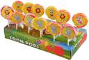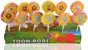 A pack of 12 lollipops from Toonpops Cartoon Lollipops , made with pure veg , with shelf life of 6 months and ingredients of sugar, liquid glucose, cream of tartar, citric acide, edible vegetable oil, permitted synthetic flavours and colours and suitable for vegans.