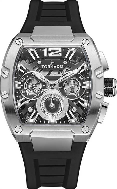 Rectangle High Quality Stainless Steel, Brushed Case Silver case with Multi Function display, Part Skeletonized, Multi Layered Black & Silver Dial 43x54mm case diameter, VX9J,High Precision Japanese Quartz movement, 10ATM water-resistant Black Premium Flexible & Durable Silicone bracelet with Tang Buckle