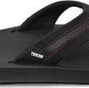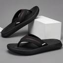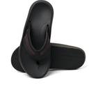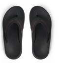These black flip-flops feature a comfortable, textured footbed and a stylish strap with red stitching details and a brand logo. Designed for durability and comfort, they are perfect for casual wear, beach trips, or relaxing by the pool. The non-slip sole provides good grip. Compatible products include shorts, t-shirts, swimwear, and loungewear.