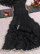 Elevate your ethnic style with this beautiful hand-printed georgette saree. Featuring a soft fabric base, this saree is adorned with delicate solid patterns in vibrant hues, giving it a refreshing and elegant look. The intricate hand-printed moti design highlights the craftsmanship and artistry of traditional techniques. Made from lightweight georgette fabric, it drapes gracefully, ensuring comfort and sophistication throughout the day.Pair this saree with a contrasting blouse and minimal jewelry to let the hand-print moti design stand out. Perfect for daytime events, festive celebrations, partyware saree, or casual gatherings, this saree adds an effortlessly chic vibe to your wardrobe. For lasting quality and to preserve the print, dry clean only. | black saree |black saree |party wear sarees|sarees|handprint saree|handpainted sarees|handpainted floral sarees