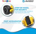 This toy has a foot accelerator that simulates a premium race experience and a Strip On Wheel for security.
