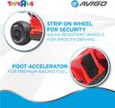 This toy has a foot accelerator that simulates a premium race experience and a Strip On Wheel for security.