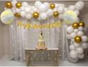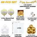 TOYXE Happy Anniversary Backdrop Net Curtain LED Light Balloons Banner Arch Decoration Set includes 1 Pc Happy Anniversary Cursive Banner, 2 Pcs Happy Happy Anniversary Round Foil Balloon, 10 Pcs Golden Chrome Balloons, 70 Pcs White Latex Balloons, 2 Net Curtain and 1 Pc LED Rice Light, 1 Pc Arch Making Strip and 1 Pc Glue Dot Tape