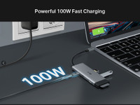 This compact USB adapter lets you expand a single USB Type-C port into seven different ports. It includes a 4K HDMI at up to 60 Hz, SD and microSD UHS-I card readers, up to 100 W power delivery, one USB Type-C data port, and two USB Type-A data ports. Thus, it provides an easy way to simplify your setup and keep everything connected.