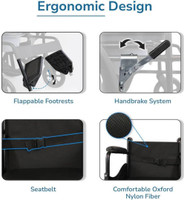 Featuring robust flappable footrests, this wheelchair ensures optimal comfort and support for the user during extended use. Courtesy of its dependable handbrake system, caregivers can maintain complete control over this wheelchair's movements, ensuring added safety on slopes or uneven terrain. And, a secure seatbelt enhances the user's confidence by preventing unintended sliding, while the seat crafted from high-quality Oxford nylon fibre offers both durability and comfort.