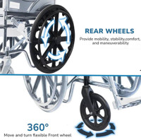 Sporting up to 360-degree rotational rear wheels, this wheelchair delivers smooth manoeuvrability across various surfaces. By incorporating improved rear-wheel mobility, users gain enhanced control for navigating tight spaces and uneven terrain. Hence, with its user-friendly design, it simplifies daily mobility needs.