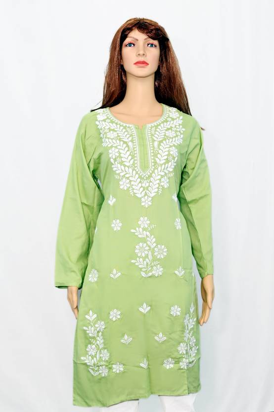 Women Embroidered Cotton Rayon A-line Kurta (Light Green)