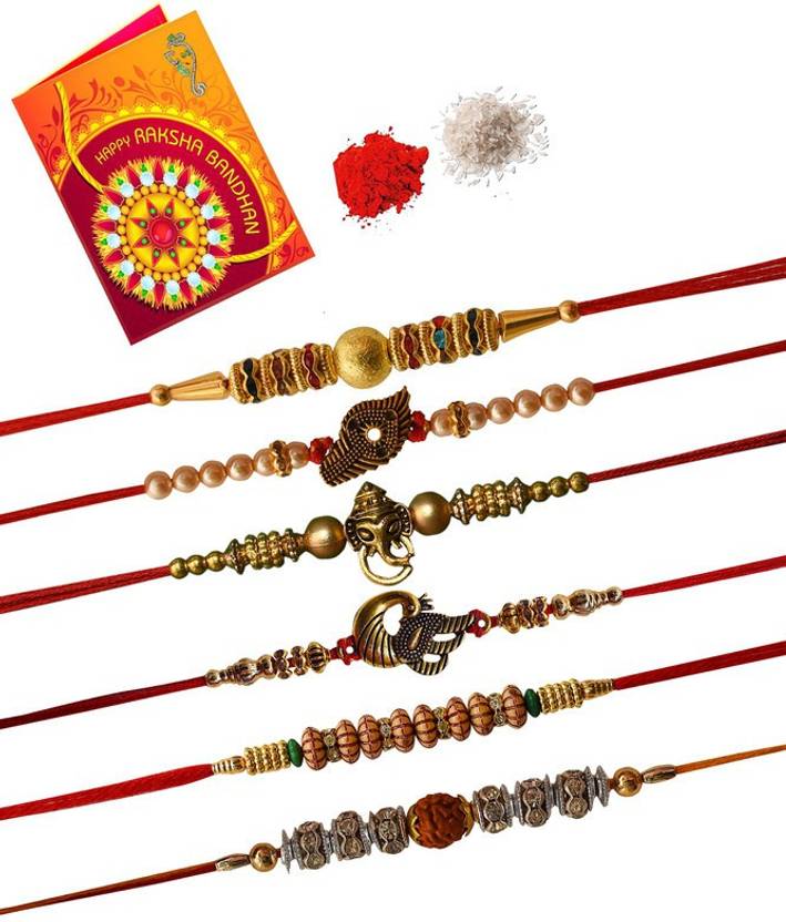 Designer BL-BM-BN-BO-BP-BD Assorted Rakhi, Chawal Roli Pack, Greeting Card SetĀ Ā (6 Rakhi, 1 Roli Chawal Set, 1 Greeting Card)