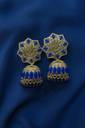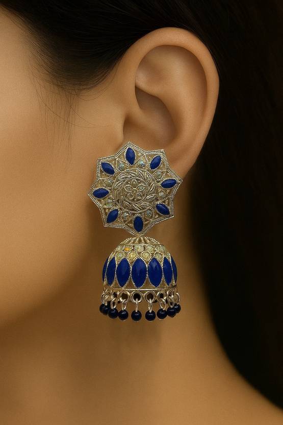 Elevate your ethnic style with these Blue Stone Studded Silver Plated Jhumka Earrings. Featuring a star-shaped stud with intricate carvings, shimmering crystals, and a dome-shaped jhumka adorned with vibrant blue stones, these earrings add a regal charm to your look. Lightweight and easy to wear, they pair beautifully with sarees, lehengas, salwar suits, and Indo-western outfits. Ideal for weddings, parties, festive celebrations, and gifting.