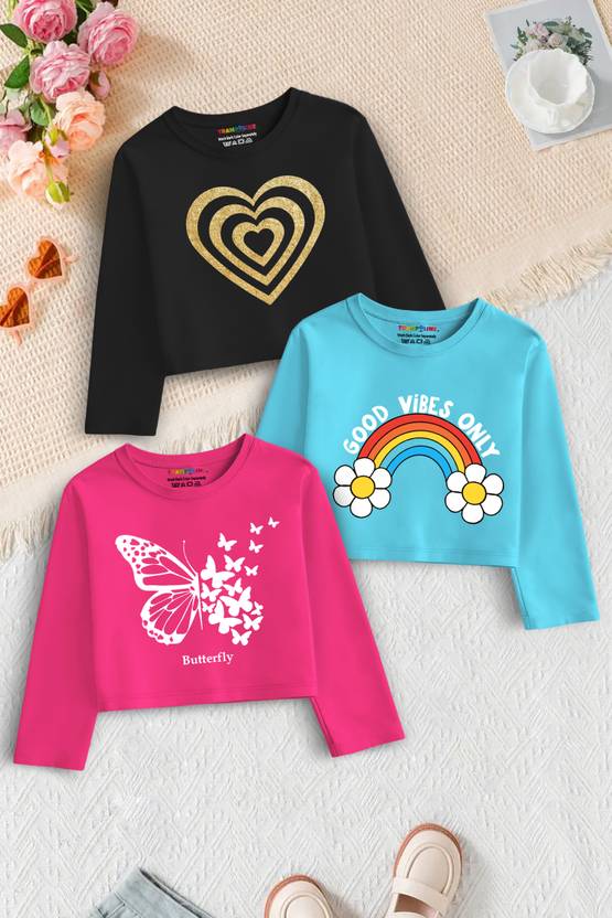 Pack of 3 stylish full sleeve crop tops with trendy graphic prints for girls., Made from soft cotton blend fabric for breathable, all-day wear., Perfect for pairing with jeans, skirts, or shorts for a casual look., Durable stitching ensures long-lasting wear and repeated washes., Ideal for daily wear, outings, parties, and gifting girls stylish outfits.