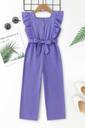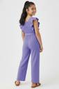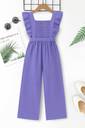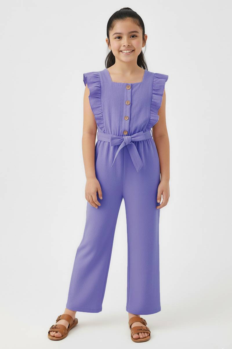 Effortlessly stylish and comfortable, this purple girls jumpsuit is crafted from soft cotton slub fabric for a breathable and natural texture. Designed with a square neckline and adorable ruffle sleeves, it perfectly blends charm with comfort. The button-down front and self-fabric belt add a touch of elegance, making it ideal for day outings, festive gatherings, or casual events. Pair it with cute sandals or ballerinas for a complete chic look.