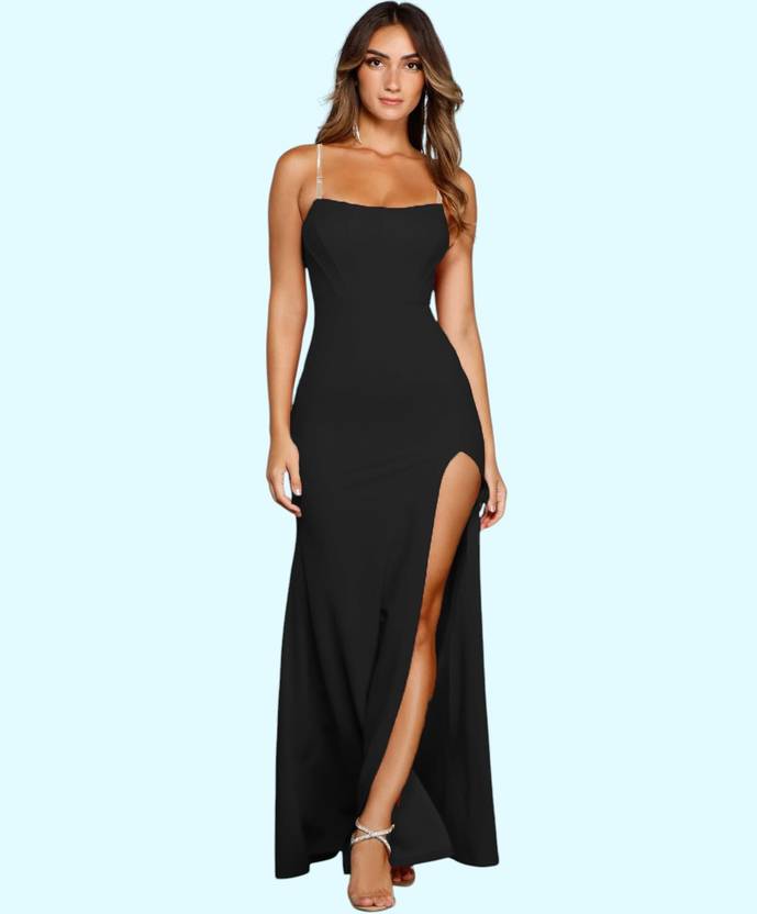 Solid Lycra Blend Stitched Flared/A-line Gown (Black)