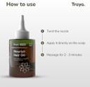 Traya Nourish Hair Oil is filled with the goodness of fresh herbs and 9 cold pressed essential oils like Rosemary Oil, Castor Oil, and Argan Oil, This lightweight formula travels to the inmost layer of your hair strands nourishes it and helps in hair growth.