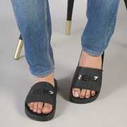 Step into comfort with these sleek black slide sandals. Featuring a wide, single strap across the foot with 'TREK' branding, these slides offer a minimalist yet stylish look. The flat, durable sole provides excellent grip and comfort for all-day wear. Perfect for casual outings, beach trips, or simply lounging at home. Compatible with: Shorts, Jeans, Track Pants, Swimwear, Casual Dresses.