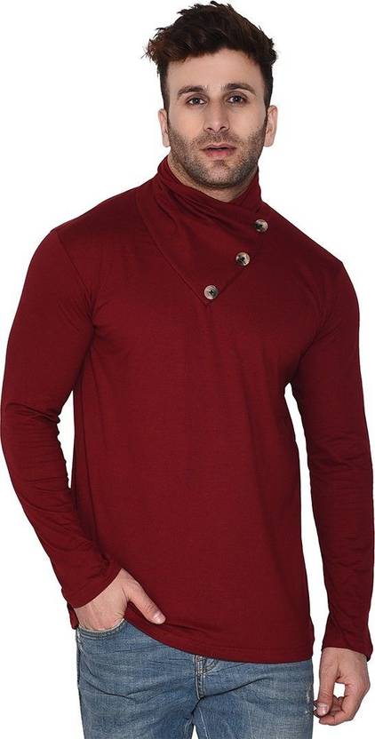 Money Leaf Faizan Men Solid High Neck Cotton Blend Maroon T-Shirt