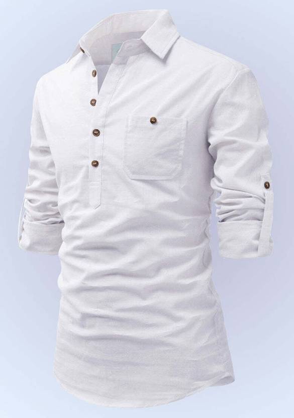 Gender: Men, Pattern: Solid, Closure: Button, Fabric: Cotton Blend, Collar: Spread Collar, Product Length: Short, Hemline: Curved, Sleeves Length: Full Roll Up Sleeve, Pocket: 1 Pocket, Pack of: 1