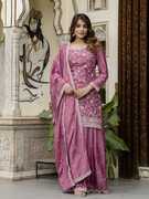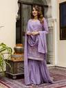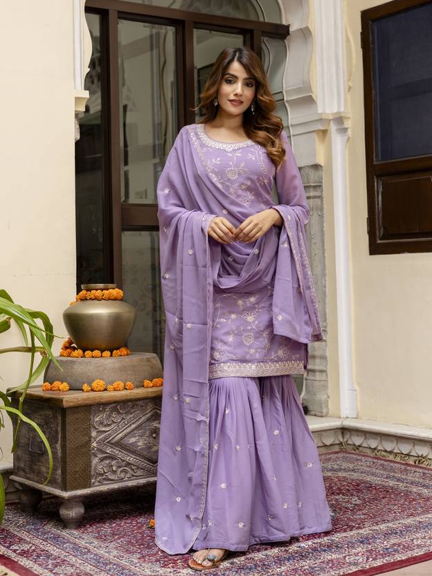 Suit Fabric: Kurta Salwar Dupatta: Art Silk; Inner: Crepe, Color: Light Purple|| Sleeves Type: 3/4 Sleeve|| Neckline: Round Neck, Style: Straight Kurta Sharara Dupatta Set || Work: Floral design thread Embroidery work, Length: Kurta: 37 In; Sleeve: 22 In| Salwar: 40 In | Dupatta: 2.20 mt [The model (height 5'8) is wearing a size S], Stitched Type: Ready to Wear Stitched Salwar Suit Set || Package Contents: 1 Kurta Pant Dupatta, Kurta set for women anarkali sharara alia cut nyra cut cotton Georgette pakistani party wear wedding festival suit salwar palazzo kurti set latest design new fashion Ethnic trendy fusion lehenga sharara kurta set with dupatta for women