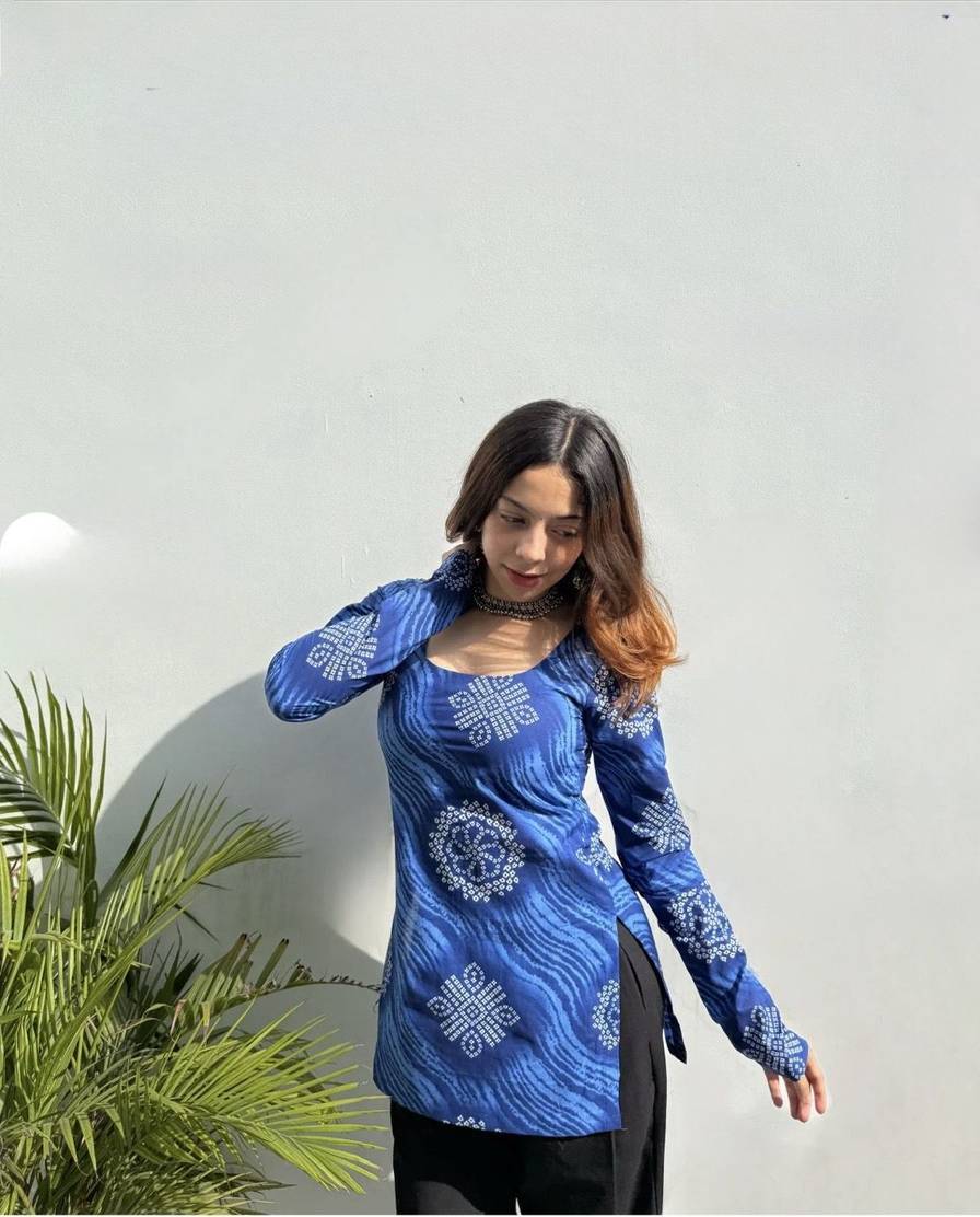 The overall vibe is a fusion of ethnic and modern fashion—the printed kurti top adds an Indian touch, while the ripped jeans give a casual, contemporary feel.