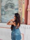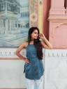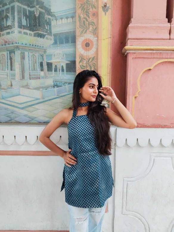 Sleeveless blue printed kurti-style top with a halter neckline and matching choker strap, paired with light blue ripped jeans. Her long, wavy hair is styled loose over one shoulder, and she has accessorized simply with small earrings and a bracelet.