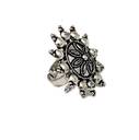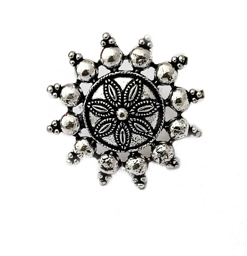 The Moonshadowed Brass Lunar Flora Oxidized Brass Ring is a handcrafted finger ring made exclusively from brass and oxidised to achieve a silver-toned hue. This lightweight and versatile accessory is a small yet affordable indulgence at just ?210. Its unique design is inspired by the celestial beauty of the moon and the delicate intricacy of flora. Suitable for everyday wear, this ring is a stylish addition to any ensemble. Please note that due to variations in brightness, contrast, and other factors, the actual product may slightly differ from the image. To ensure longevity, keep this ring dry and away from sweat and chemicals. Explore our other exquisite offerings to complement your personal style.