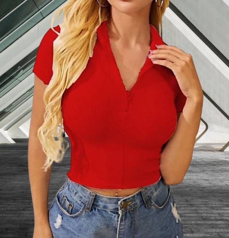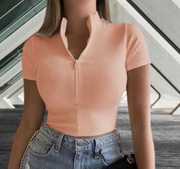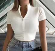 Minimalist and modern, featuring a short front zipper that allows for adjustable neckline styling.High collar that gives the top a sleek, semi-athleisure look.fitted to the arms, contributing to the clean silhouette.hugging the body and ending above the waist to accentuate the figure.The fabric appears to be a smooth, stretchy knit, likely a cotton-spandex or polyester blend for comfort and shape retention.