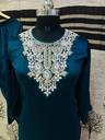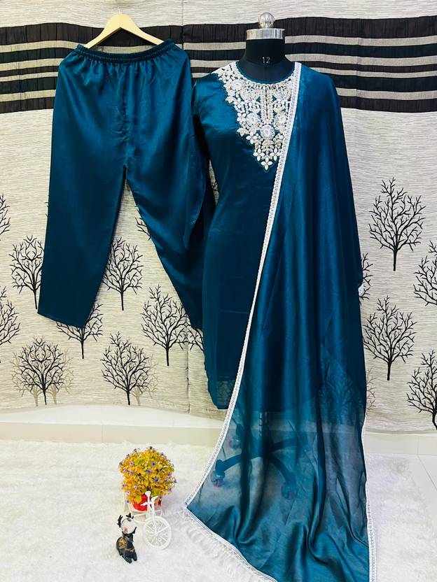 Elegant black salwar suit set featuring a straight-cut kurta adorned with intricate silver and white thread embroidery and beadwork on the neckline, paired with matching black pants. The ensemble includes a sheer black dupatta with delicate white lace border, creating a sophisticated and graceful look ideal for festive occasions or formal gathering