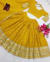 This Chinnon Lehenga Choli with Dupatta Set features exquisite Sequins With zari embroidery, enhancing its regal appeal. The deep yellow hue is adorned with intricate golden threadwork, creating a luxurious contrast. The lehenga boasts a heavily embroidered border, while the choli has detailed sleeve embellishments for an elegant touch. The matching dupatta, with delicate motifs and pearl lace edging, adds a graceful charm. A perfect blend of tradition and modern elegance, this set is ideal for festive and wedding occasions. (Lehenga(Semi-Stitched) waist:- Upto 40 (In)" || Height:- 43 (In) || Blouse(Unstitched) Bust:- Upto 44 (In)" || Dupatta Length: 2.25 (mtr). )