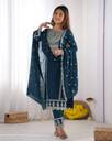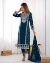This exquisite Cotton Silk Kurta Pant set is adorned with intricate Lucknowi-style embroidery and Sequins work, enhancing its regal appeal. The detailed embellishments on the neckline, sleeves, and hem add a touch of luxury, while the scalloped borders elevate its charm. The matching dupatta is beautifully decorated with delicate motifs and elegant lacework, completing the sophisticated look. Perfect for festive occasions and grand celebrations, this ensemble exudes grace and elegance.