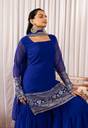 Elevate your ethnic charm with this stunning Georgette Kurta Sharara with Dupatta Set, designed in a rich royal blue shade. The kurta features a stylish square neckline with sheer long sleeves, beautifully highlighted with intricate zari and mirror embroidery on the cuffs and hemline. The flowy layered sharara adds grace and volume, making it perfect for festive and wedding occasions. The soft georgette dupatta is adorned with delicate sequins and an embroidered border that enhances the overall look. A perfect blend of tradition and elegance, this outfit is sure to make you stand out in style.