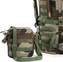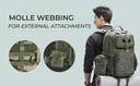 Mutiple MOLLE webbing and complementary attachments including a waist pouch and a sling bag that is attached to the bag but can be taken out for using separately. Also comes with a carabiner.