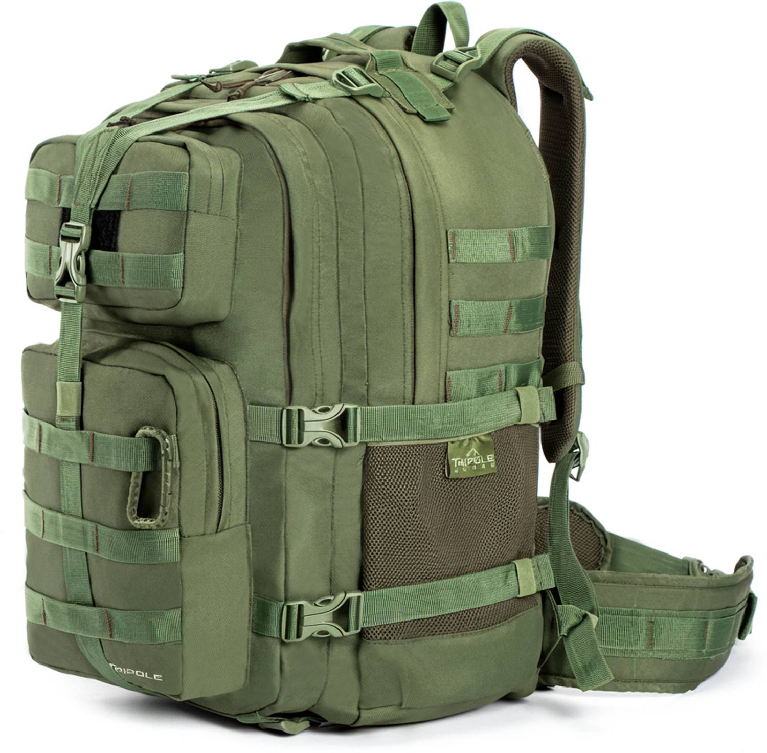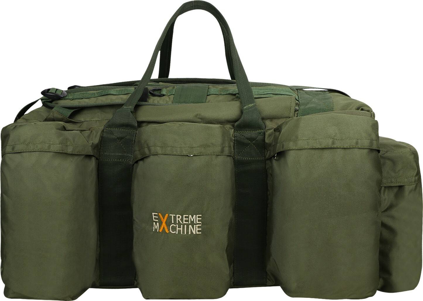 Mutiple MOLLE webbing and complementary attachments including a waist pouch and a sling bag that is attached to the bag but can be taken out for using separately. Also comes with a carabiner.