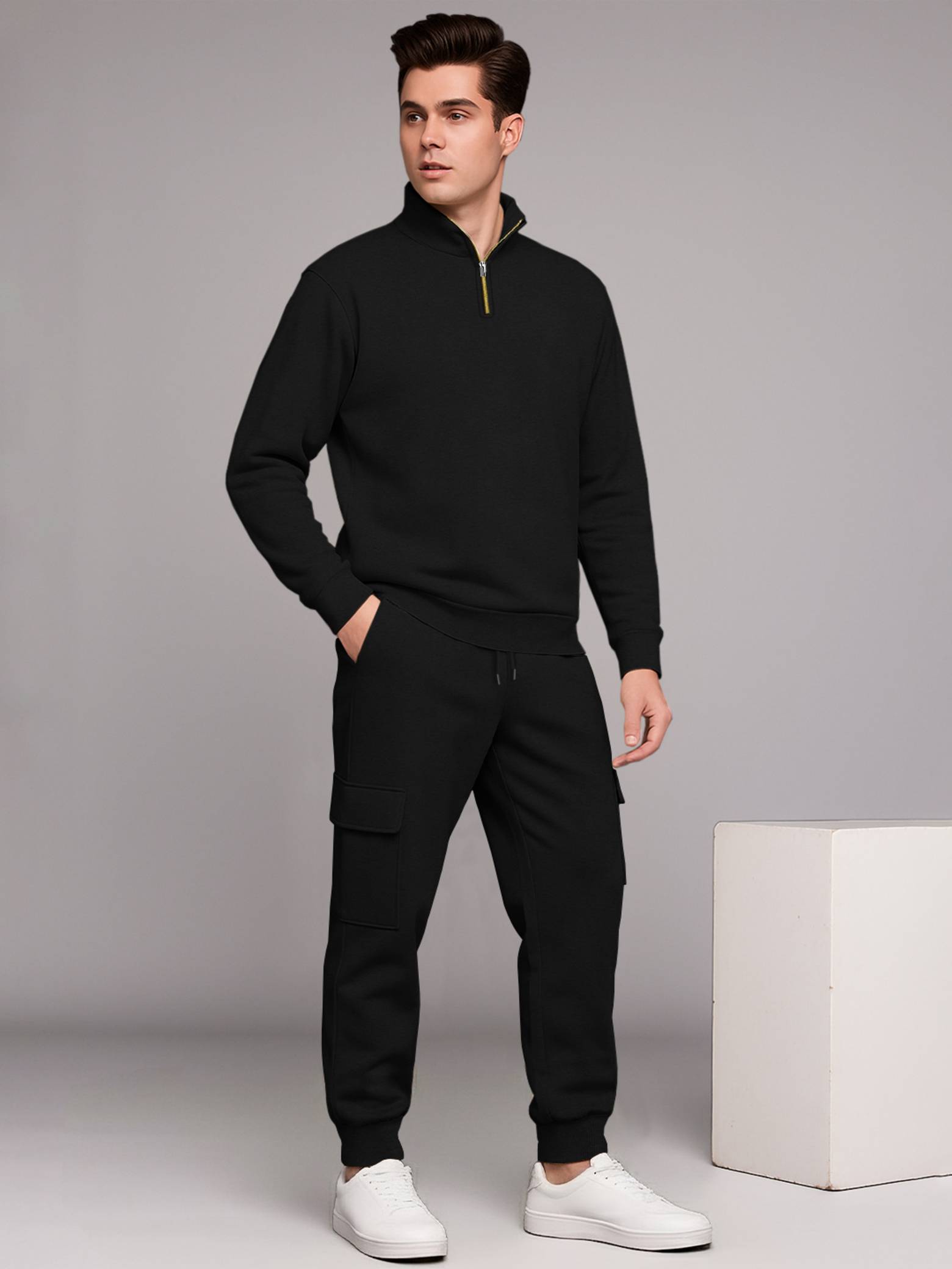 Stay on-trend and comfortable with this stylish TRIPR full sleeve Henley Neck perfectly paired with baggy cargo pants. The Sweatshirt features a sleek zip-up neckline that adds a sporty, modern touch, while its relaxed fit ensures all-day comfort. The TRIPR cargo pants come with a loose, baggy silhouette and multiple utility pockets, offering the ideal combination of function and fashion. Whether you're heading out for streetwear-inspired looks, traveling, or enjoying a laid-back weekend, this outfit delivers a bold blend of contemporary style and everyday practicality - only from TRIPR.A Cargo plain baggy tracksuit typically consists of a loose-fitting, unadorned Sweatshirt and matching pants, usually made from soft, comfortable materials like cotton blends.