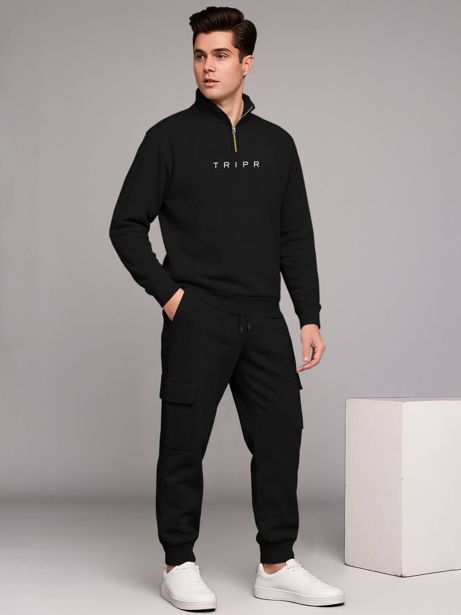 Stay on-trend and comfortable with this stylish TRIPR full sleeve Henley Neck perfectly paired with baggy cargo pants. The Sweatshirt features a sleek zip-up neckline that adds a sporty, modern touch, while its relaxed fit ensures all-day comfort. The TRIPR cargo pants come with a loose, baggy silhouette and multiple utility pockets, offering the ideal combination of function and fashion. Whether you're heading out for streetwear-inspired looks, traveling, or enjoying a laid-back weekend, this outfit delivers a bold blend of contemporary style and everyday practicality - only from TRIPR.A Cargo plain baggy tracksuit typically consists of a loose-fitting, unadorned Sweatshirt and matching pants, usually made from soft, comfortable materials like cotton blends.